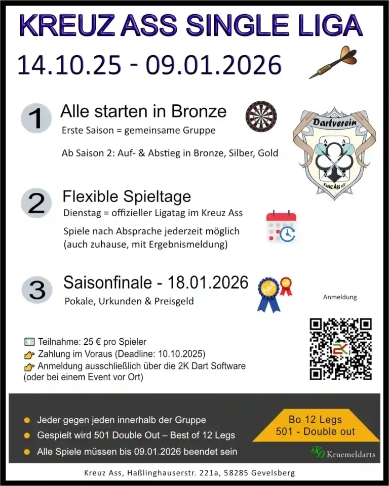 Die Anmeldung zur Kreuz Ass Single Liga erfolgt ausschließlich über die 2K Dart Software oder – sofern es zeitlich passt – bei einem Event im Kreuz Ass.