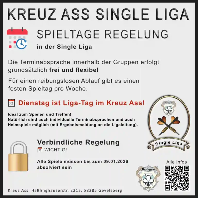 👉 Heimspiele zuhause sind erlaubt, das Ergebnis muss aber an die Ligaleitung gemeldet werden (da Live-Scoring über den Darts Scorer nur im Kreuz Ass verfügbar ist).