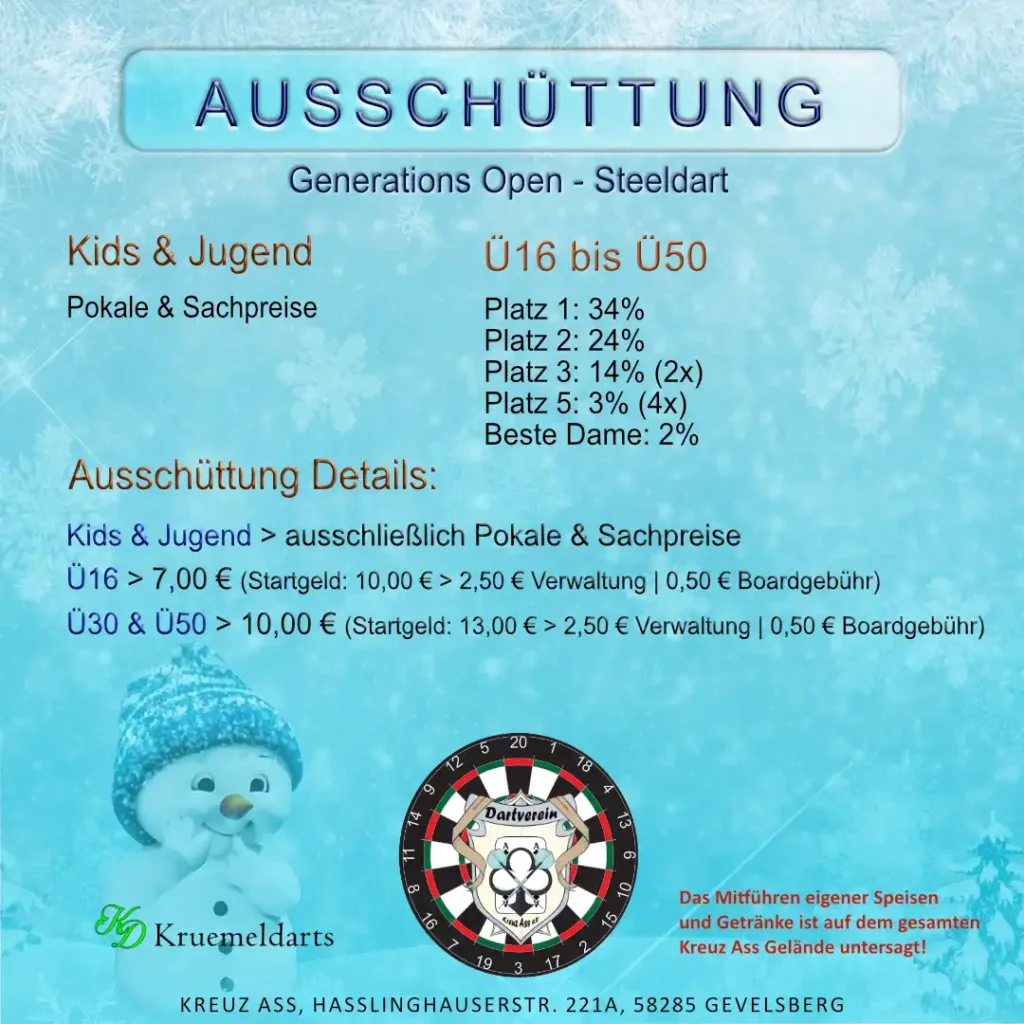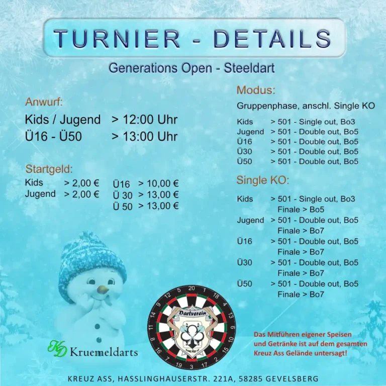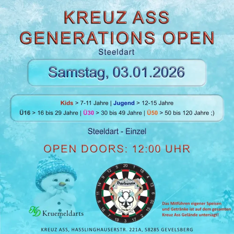 Am Samstag, den 03.01.2026, veranstalten wir im Kreuz Ass zum ersten Mal die GENERATIONS OPEN – ein Steeldart-Event, das alle Altersgruppen an einem Tag zusammenbringt.